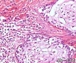 Плоскоклеточный рак III степени дифференцировки представлен резко атипичными клетками, образующим солидные структуры, в которых лишь на отдельных участках прослеживается тенденция к стратификации. Лишь отдельные эпителиоциты сохраняют способность к внутриклеточному синтезу кератогиалина.
