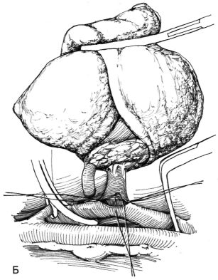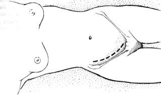 Разрез. Производят клюшкообразный разрез по Гибсону справа, проходящий на 2 см медиальнее передней верхней подвздошной ости и заканчивающийся чуть выше лобкового симфиза. Рассекают наружную и внутреннюю косые и поперечную мышцы живота. При необходимости для более широкого доступа к мочевому пузырю частично рассекают влагалище прямой мышцы живота и саму мышцу, затем разрез продолжают вверх до конца XII ребра.