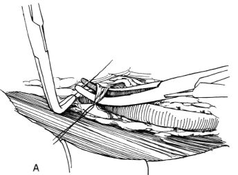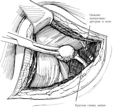 У женщин пересекают и перевязывают круглую связку матки. У мужчин находят семенной канатик и вьщеляют его до входа в паховый канал. Канатик можно взять на резиновую держалку и отвести медиально вместе с медиальным краем раны. Семявыносящий проток или сосуды семенного канатика обычно пересекать не приходится.