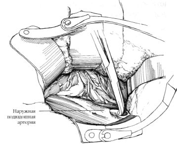 Отслаивая брюшину в подвздошной ямке, обнажают дистальные отделы общей и наружной подвздошных артерий. Начинают выделять дистальный отдел подвздошной артерии. Хотя лимфоцеле после пересадки почки часто обусловлено подтеканием лимфы из лимфатических сосудов донорской почки, тем не менее следует избегать повреждения крупных лимфатических стволов, выходящих из бедренного канала, стараясь при выделении сосудов держаться проксимальнее его на 2-3 см. Перед пересечением лимфатических сосудов их перевязывают, что предпочтительнее клипирования. Наружную подвздошную артерию выделяют в проксимальном направлении, переходя на общую подвздошную - на несколько сантиметров. Артерию денудируют острым путем и поднимают вверх. Желательно подшить почечную артерию, особенно правой почки, к передней поверхности общей подвздошной артерии.