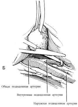 А. Пальпируют стенки общей подвздошной и внутренней подвздошной артерии в зоне бифуркации. При обнаружении атеро-склеротических изменений внутреннюю подвздошную артерию не выделяют и анастомозируют почечную артерию конец в бок с наружной подвздошной артерией. Если атеросклеротические изменения незначительны или можно выполнить эндартерэктомию, то тщательно перевязывают и пересекают лимфатические сосуды в области бифуркации для выделения внутренней подвздошной артерии.