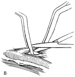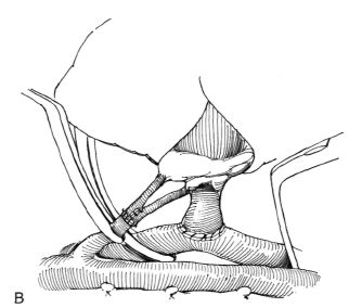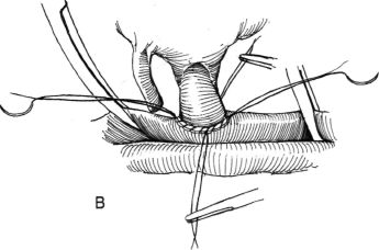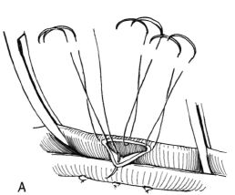 В. Нитью шва, наложенного на верхний угол разреза, формируют латеральную стенку анастомоза, а нитью на нижнем углу разреза - медиальную. На углах нити связывают друг с другом, концы нитей срезают.