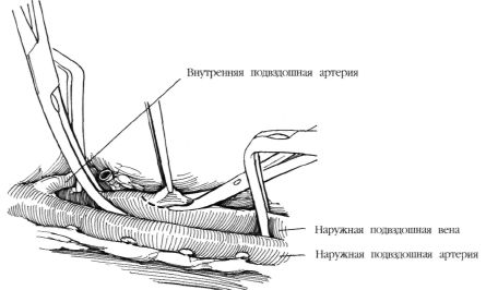Выделяют подвздошную вену, стараясь перевязать все лимфатические сосуды, расположенные на ее поверхности. Притоки вены, впадающие в нее по задней поверхности, дважды перевязывают и пересекают, стараясь не брать их зажимами из-за опасности отрыва. На проксимальный отдел вены накладывают изогнутый, а на дистальный - угловой зажим Дебейки. Изогнутыми ножницами Дебейки для эндартерэктомии вырезают эллипсовидный участок венозной стенки. Промывают просвет вены гепаринизированным физиологическим раствором.