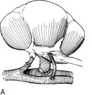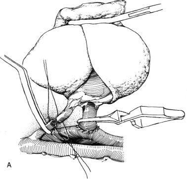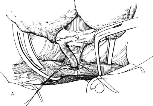 В. Потягивая за швы-держалки, поворачивают анастомоз на 180° и аналогичным образом накладывают швы на его заднюю стенку. Накладывать непрерывный шов не следует, так как он может наподобие кисета сузить анастомоз, даже при наложении 4 фиксационных швов.