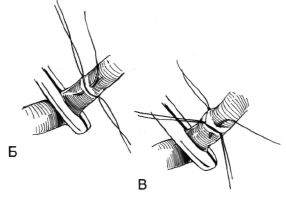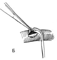 Б. Сшивают стенки артерий по краям разрезов и после последнего стежка каждую из нитей завязывают.
