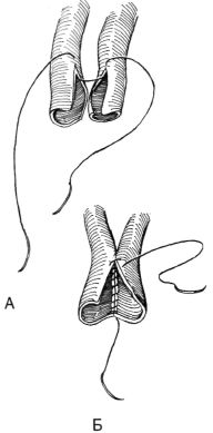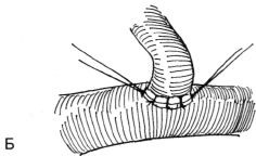Б. Узловыми швами последовательно формируют латеральную и медиальную стенки анастомоза. Первый шов накладывают на середине между 2 швами-держалками, следующие 2 шва накладывают на середине каждого из квадрантов, концы нитей срезают.
