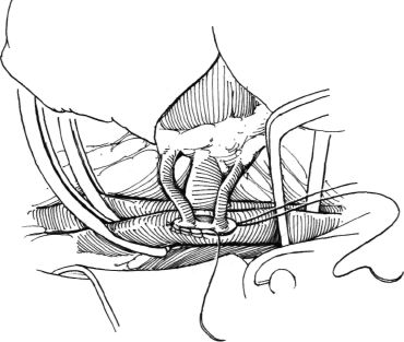 Инструменты. Основной набор инструментов для лапаротомии, сосудистые инструменты, пинцет Микстера, изогнутый и угловой аортальные зажимы Дебейки, 3 детских сосудистых зажима, изогнутые ножницы Дебейки для эндартерэктомии, катетер Робинсона 8F, гепаринизированный физиологический раствор, раствор бацитра-цина с неомицином для орошения раны, синтетические рассасывающиеся нити 3-0, 1-0, кетгутовые нити 4-0, плетеные нейлоновые нити 1-0 или 2-0, нити 5-0, 6-0 и 7-0 для сшивания сосудов, нейлоновые нити 4-0 для ушивания кожи.