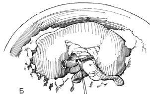 Б. Изогнутыми ножницами Дебейки для эндартерэктомии по обеим сторонам разреза иссекают участок стенки в виде половинок эллипса, формируя овальное отверстие с гладкими краями.
