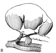 А. При альтернативном способе главную почечную артерию анастомозируют конец в конец с внутренней подвздошной, а артерию нижнего сегмента - конец в бок с наружной подвздошной. Б и В. Другой альтернативой является экстракорпоральное наложение анастомоза конец в бок между небольшой по диаметру артерией, идущей к полюсу почки, и главной почечной артерией. Анастомоз накладывают узловыми швами нитью 6-0 или 7-0 с использованием очков-луп в условиях охлаждения почки ледяным «салом». Необходимо сохранять артерии, идущие к полюсам почки, так как эти сосуды часто снабжают кровью почечную лоханку.