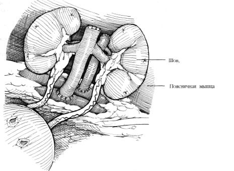 Почки удаляют единым блоком и ушивают проксимальные концы аорты и нижней полой вены. Анастомозируют аорту трансплантата с наружной подвздошной артерией реципиента, а нижнюю полую вену трансплантата - с наружной подвздошной веной. Мочеточники имплантируют в мочевой пузырь.